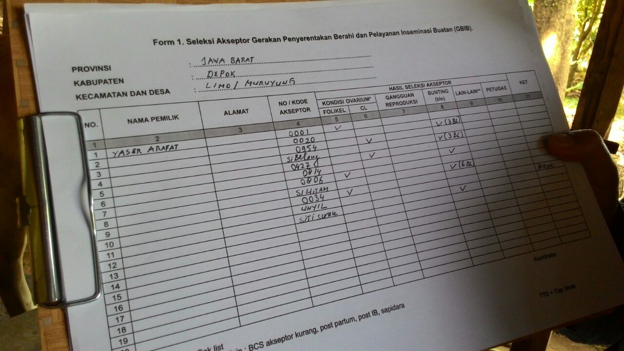 Dinas Pertanian, Peternakan dan Perikanan kota Depok dengan tim terdiri dari Drh. Hendra Mahendra, didampingi Bpk. Ahmad Sukardi, Spt dan Bpk. Jarkasih Effendi bersama tim dari Badan Inseminasi Buatan kota Lembang yaitu Drh. Ngurah Raka, Bpk. Yadi Rohadi dan Bpk. Cepi Hidayah, bersama-sama melakukan pengecekan kesiapan sapi perah (Freisian Holstein) sebelum dilakukan inseminasi buatan.